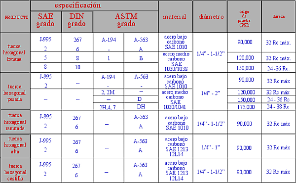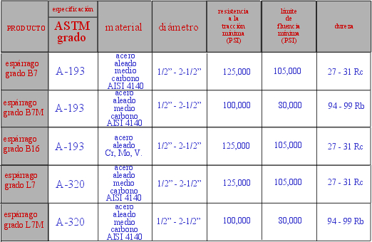 presentan en esta tabla corresponden a Tornillo de acero al