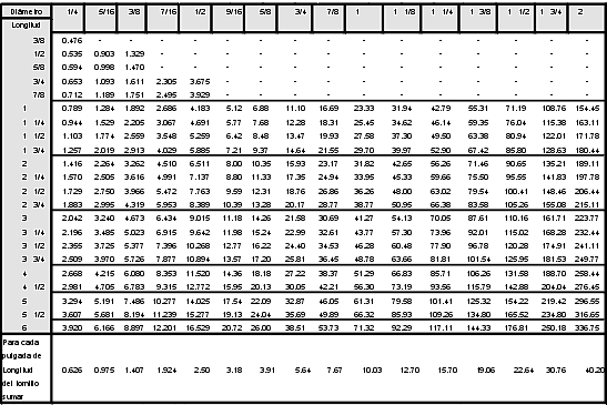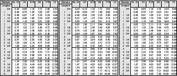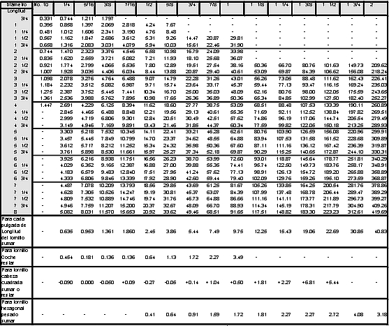 | Notas: 1.-Los pesos que se presentan en la tabla para el diámetro del No.10 corresponden a tornillo coche; y los pesos de los diámetros de 1/4" hasta 2" corresponden a tornillo hexagonal. Para los pesos de otros diámetros de tornillo coche, y todos los demás tamaños para los tornillos pesados y tornillos cabaza cuadrada y las lomgitudes adicionales a las de esta tabla aplicar el peso diferencial correspondiente. 2.-Todos los pesos son aproximados para tornillos en acero al carbono. |